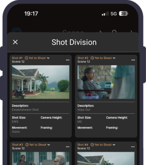 Bring clarity and precision to every shot with Behind The Scene App's Shot Division module. Easily organize your visual plan by uploading photos, drawings, or concept frames for each shot. You can also capture reference images directly using your phone’s camera within the app — perfect for quick on-set visual notes.